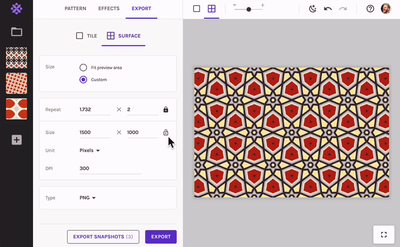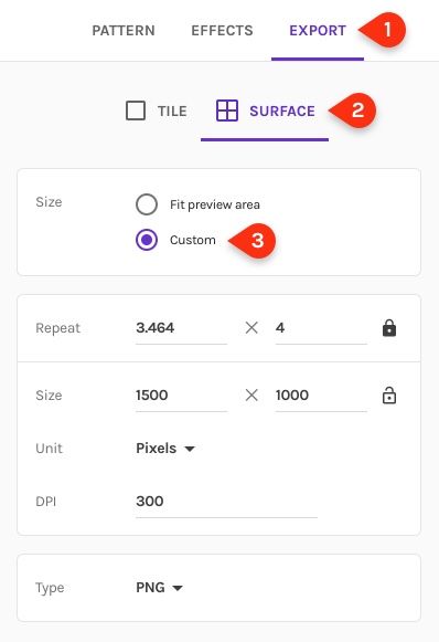 To create a pattern-filled surface in Repper, you go to Export (1) and select Surface (2). By default, the surface will be the size of your full preview area. To set a specific size, click on Custom (3):