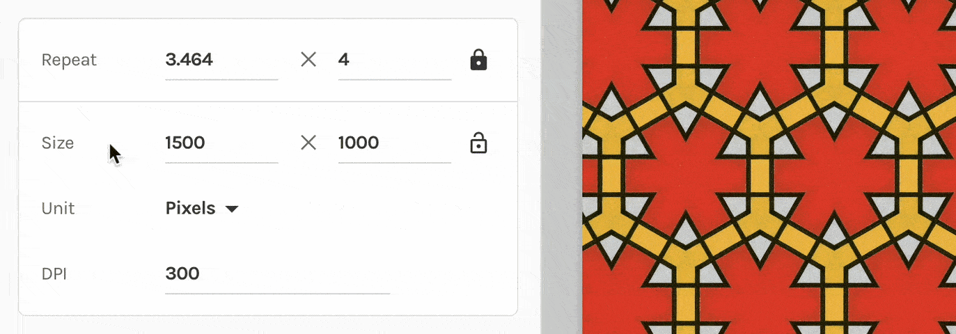 This means you can freely set the width and height of your surface, while the horizontal and vertical repeat will automatically update to match the dimensions. This is the right option for you if you are trying to export at a specific size in pixels, inches, centimeters, etc.