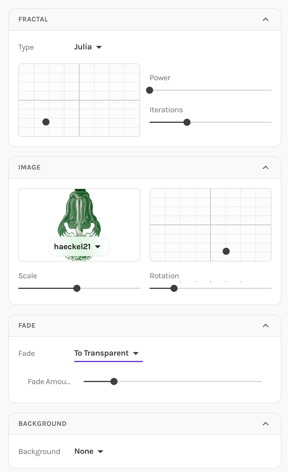 - Fade: Make higher iterations fade to transparency for a sense of infinite depth.