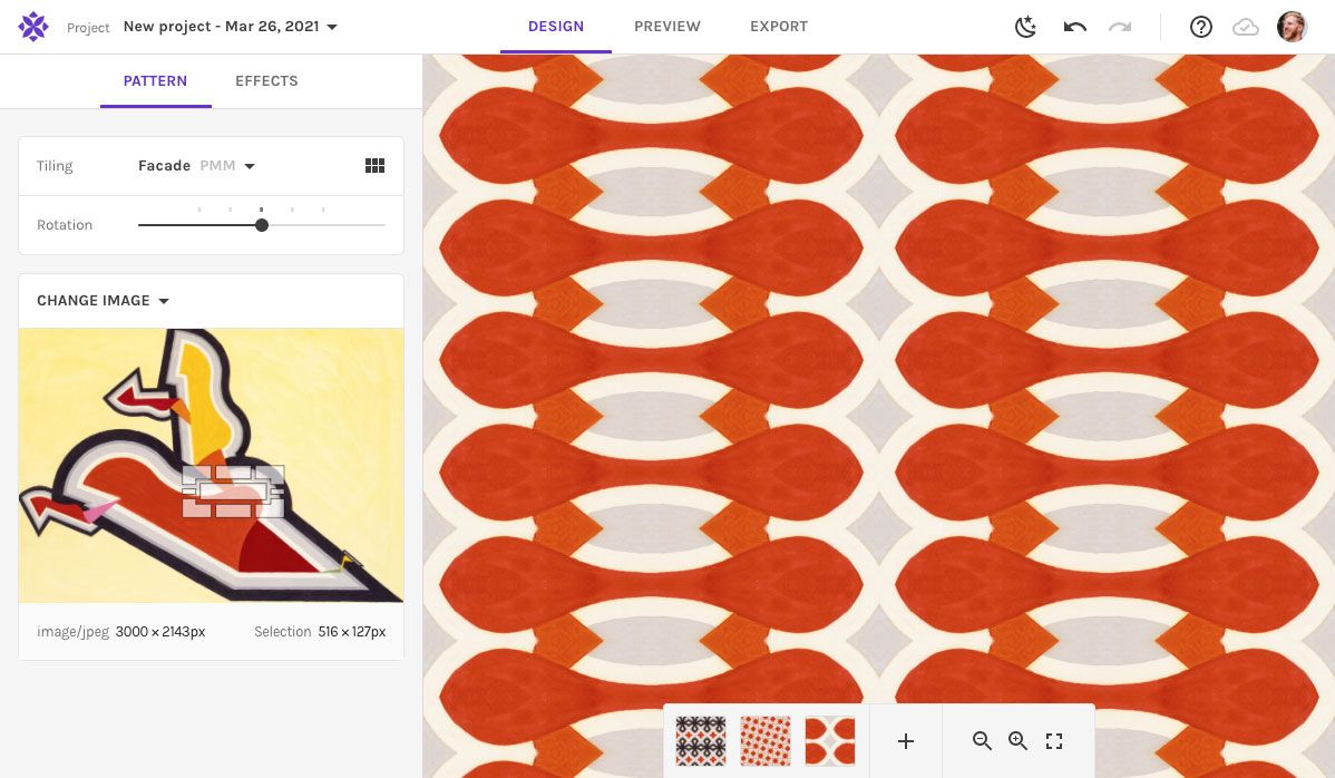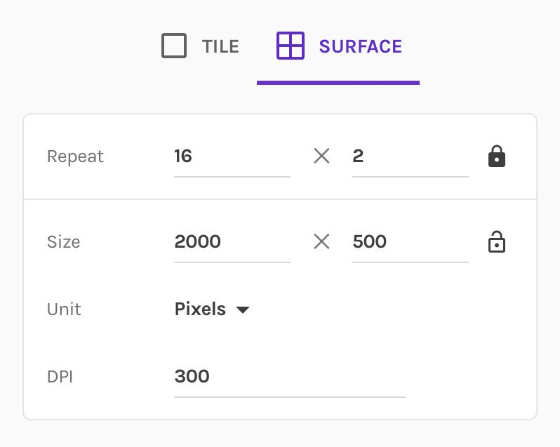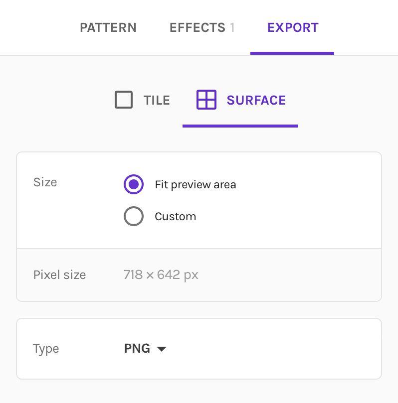 We've moved the export settings to the left sidebar. Whatever export setting you choose is how your pattern will be shown in preview. By default, the surface fits the entire preview area. Set it to your own custom size, and it will stay that wayβalso when switching back to the other tabs, so you see exactly what you'll be exporting!