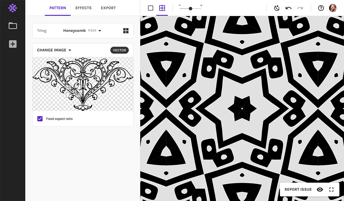 Important: To guarantee smooth performance in the app, Repper will by default preview your vector pattern in bitmap. If you notice the pattern preview looking pixelated, consider enabling vector preview (learn more). Note that your exported pattern will always be a crisp vector pattern, regardless of the preview mode in the app.